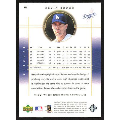 This is a 2000 SP Authentic Kevin Brown baseball card. The card is #61 and pictures show condition.