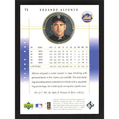 This is a 2000 SP Authentic Edgardo Alfonzo baseball card. The card is #73 and pictures show condition.