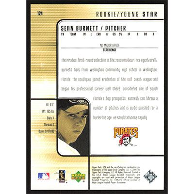 This is a 2000 SPx Sean Burnett autographed baseball card. This card has been signed, in blue, by Sean Burnett, and is guaranteed authentic by Ballcardz.com. The card is #124 and pictures show condition. This card is limited; #'d 1108/1600.