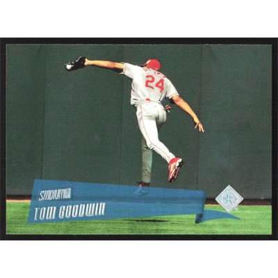 This is a 2000 Stadium Club Tom Goodwin baseball card. The card is #58 and pictures show condition.