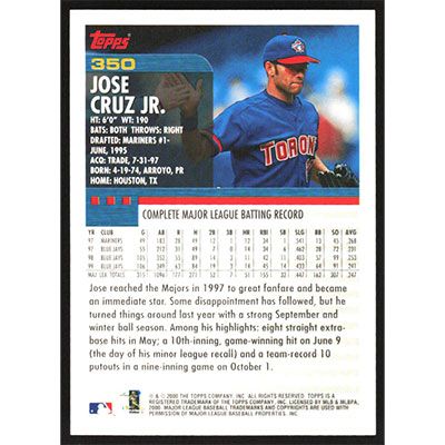This is a 2000 Topps Jose Cruz Jr. baseball card. The card is #350 and pictures show condition.