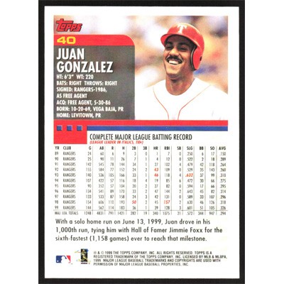 This is a 2000 Topps Juan Gonzalez baseball card. The card is #40 and pictures show condition.