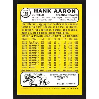 This is a 2000 Topps Aaron Hank Aaron 1968 baseball card. The card is #15 and pictures show condition.