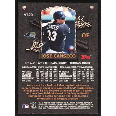 This is a 2000 Topps All-Topps Jose Canseco baseball card. The card is #AT20 and pictures show condition.