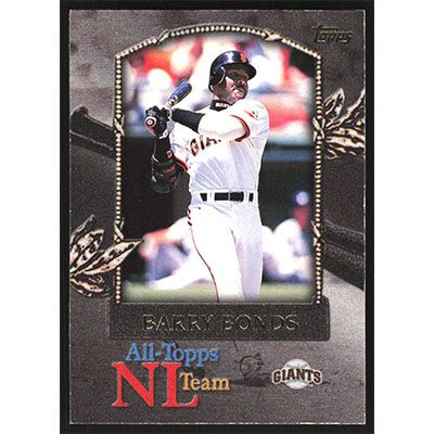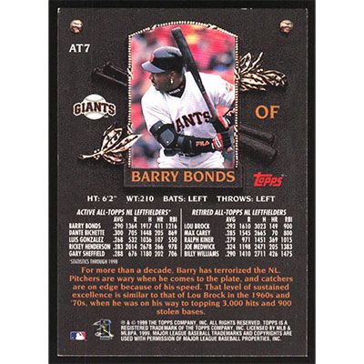 This is a 2000 Topps All-Topps Barry Bonds baseball card. The card is #AT7 and pictures show condition.