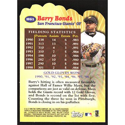 This is a 2000 Topps Hands of Gold Barry Bonds baseball card. The card is #HG1 and pictures show condition.