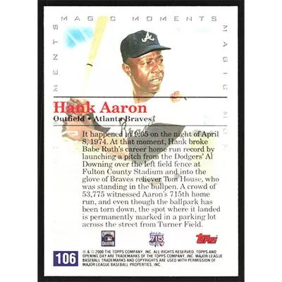 This is a 2000 Topps Opening Day Hank Aaron Magic Moments 715th Home Run baseball card. The card is #106 and pictures show condition. Team(s): Atlanta Braves