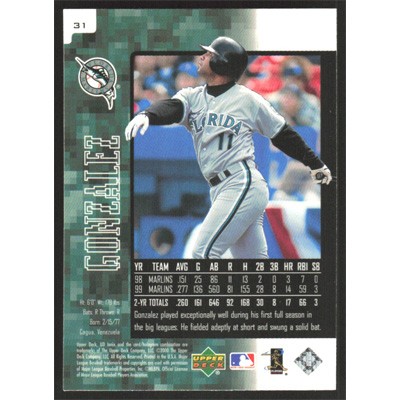 This is a 2000 UD Ionix Alex Gonzalez baseball card. The card is #31 and pictures show condition.