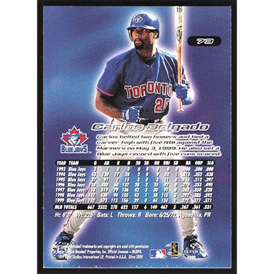 This is a 2000 Ultra Carlos Delgado baseball card. The card is #73 and pictures show condition.
