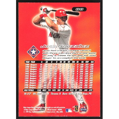 This is a 2000 Ultra Juan Gonzalez baseball card. The card is #80 and pictures show condition.