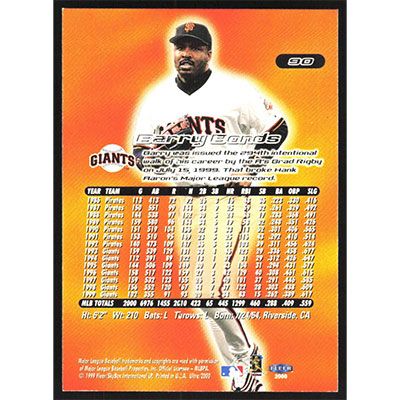 This is a 2000 Ultra Barry Bonds baseball card. The card is #90 and pictures show condition.