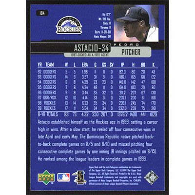 This is a 2000 Upper Deck Pedro Astacio baseball card. The card is #104 and pictures show condition.