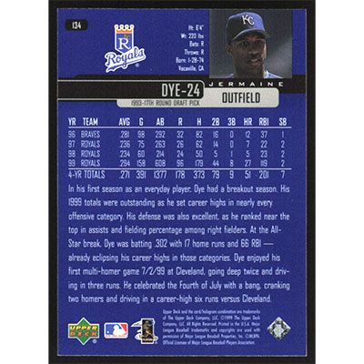 This is a 2000 Upper Deck Jermaine Dye baseball card. The card is #134 and pictures show condition.
