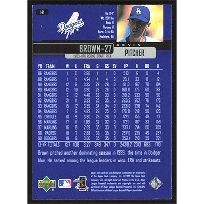 This is a 2000 Upper Deck Kevin Brown baseball card. The card is #141 and pictures show condition.