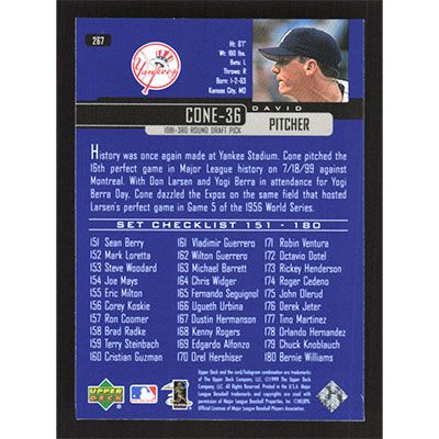 This is a 2000 Upper Deck David Cone baseball card. The card is #267 and pictures show condition.