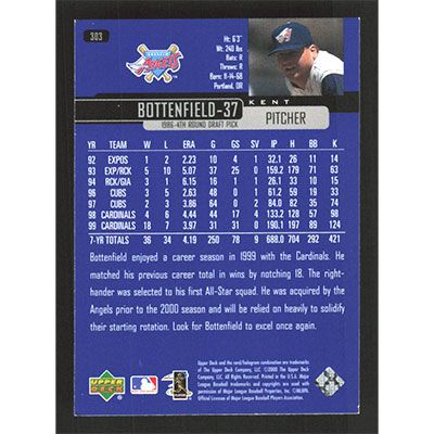 This is a 2000 Upper Deck Kent Bottenfield baseball card. The card is #303 and pictures show condition.