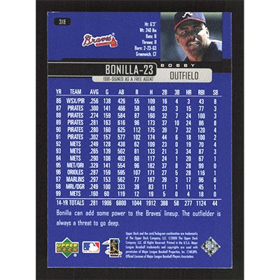 This is a 2000 Upper Deck Bobby Bonilla baseball card. The card is #318 and pictures show condition.