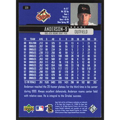 This is a 2000 Upper Deck Brady Anderson baseball card. The card is #329 and pictures show condition.