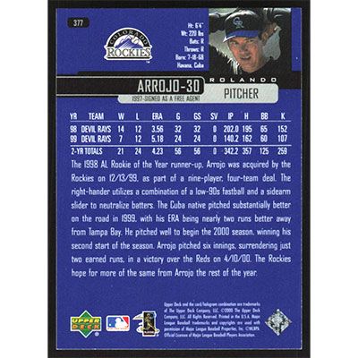 This is a 2000 Upper Deck Rolando Arrojo baseball card. The card is #377 and pictures show condition.