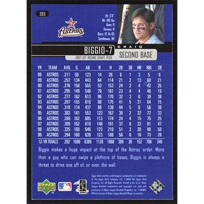 This is a 2000 Upper Deck Craig Biggio baseball card. The card is #393 and pictures show condition.