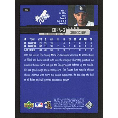 This is a 2000 Upper Deck Alex Cora baseball card. The card is #415 and pictures show condition.