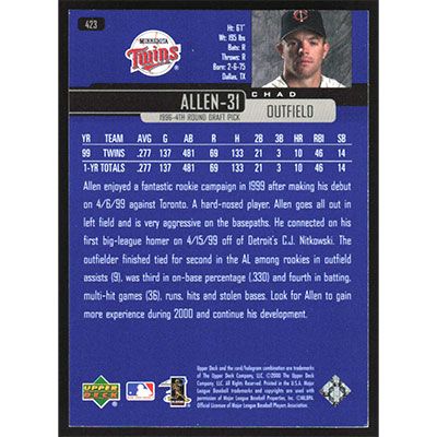 This is a 2000 Upper Deck Chad Allen baseball card. The card is #423 and pictures show condition.