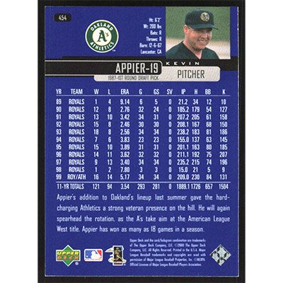 This is a 2000 Upper Deck Kevin Appier baseball card. The card is #454 and pictures show condition.