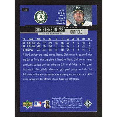 This is a 2000 Upper Deck Ryan Christenson baseball card. The card is #455 and pictures show condition.