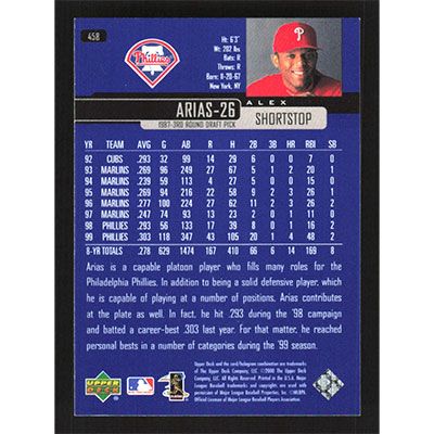 This is a 2000 Upper Deck Alex Arias baseball card. The card is #458 and pictures show condition.