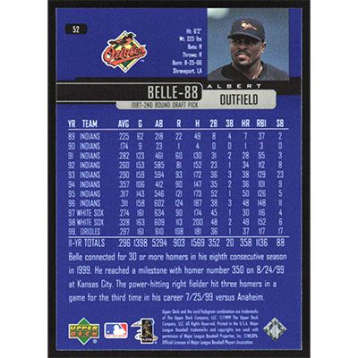 This is a 2000 Upper Deck Albert Belle baseball card. The card is #52 and pictures show condition.