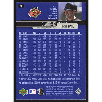 This is a 2000 Upper Deck Will Clark baseball card. The card is #54 and pictures show condition.