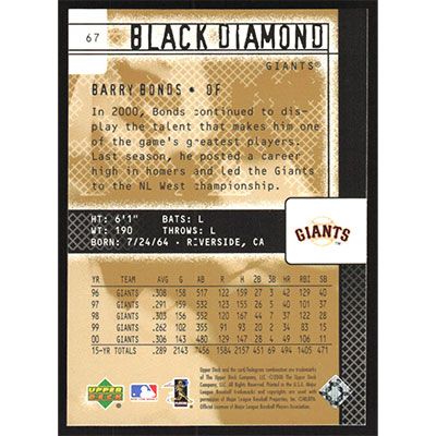 This is a 2000 Upper Deck Black Diamond Rookie Edition Barry Bonds baseball card. The card is #67 and pictures show condition. Team(s): San Francisco Giants