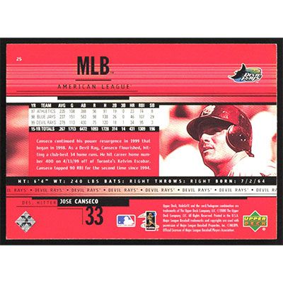 This is a 2000 Upper Deck HoloGrFX Jose Canseco baseball card. The card is #25 and pictures show condition.