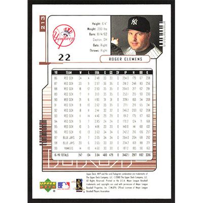 This is a 2000 Upper Deck MVP Roger Clemens baseball card. The card is #213 and pictures show condition.
