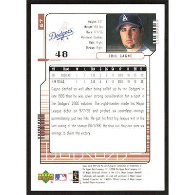 This is a 2000 Upper Deck MVP Eric Gagne baseball card. The card is #67 and pictures show condition.