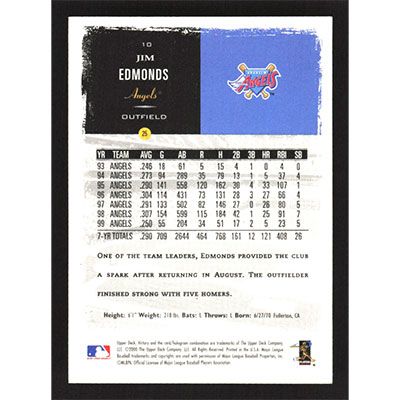 This is a 2000 Upper Deck Victory Jim Edmonds baseball card. The card is #10 and pictures show condition.