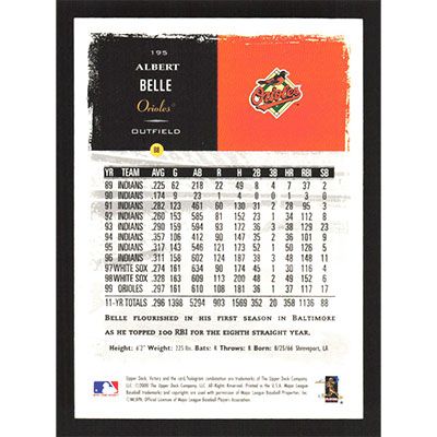 This is a 2000 Upper Deck Victory Albert Belle baseball card. The card is #195 and pictures show condition.