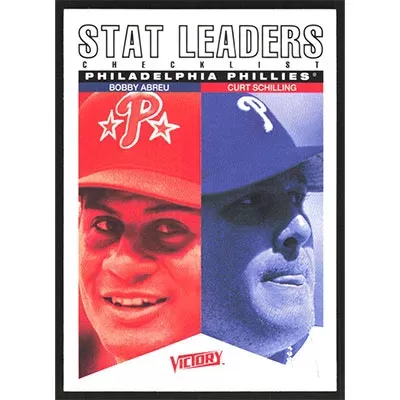 This is a 2000 Upper Deck Victory Bobby Abreu and Curt Schilling Stat Leaders Checklist baseball card. The card is #222 and pictures show condition. Team(s): Philadelphia Phillies