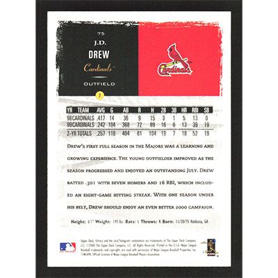 This is a 2000 Upper Deck Victory J.D. Drew baseball card. The card is #75 and pictures show condition.