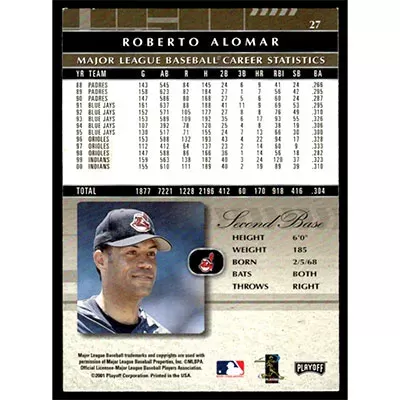 This is a 2001 Absolute Memorabilia Roberto Alomar baseball card. The card is #27 and pictures show condition.