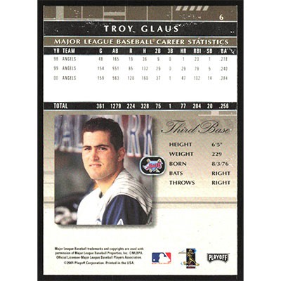 This is a 2001 Absolute Memorabilia Troy Glaus baseball card. The card is #6 and pictures show condition.