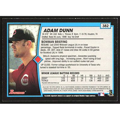 This is a 2001 Bowman Adam Dunn baseball card. The card is #382 and pictures show condition.