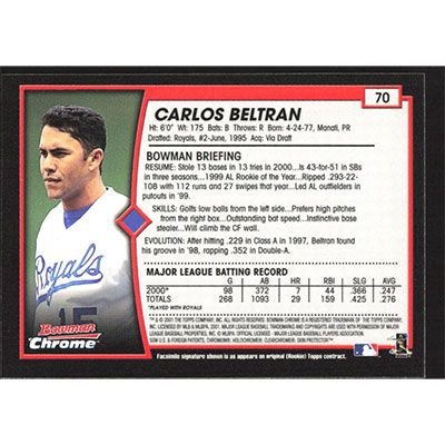 This is a 2001 Bowman Chrome Carlos Beltran baseball card. The card is #70 and pictures show condition.