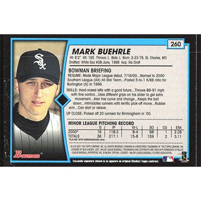 This is a 2001 Bowman Gold Mark Buehrle baseball card. The card is #260 and pictures show condition.