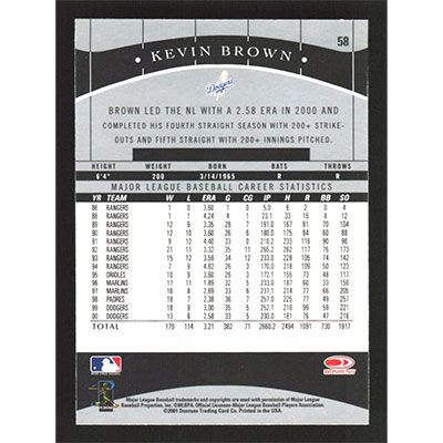 This is a 2001 Donruss Classics Kevin Brown baseball card. The card is #58 and pictures show condition.