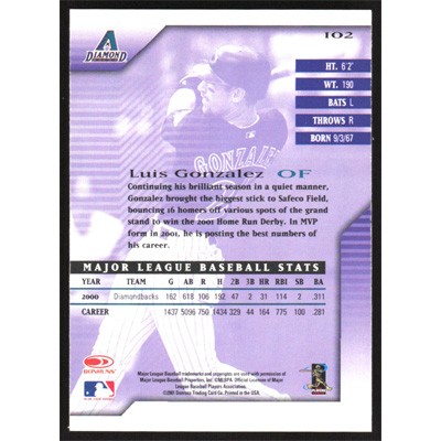 This is a 2001 Donruss Signature Series Luis Gonzalez baseball card. The card is #102 and pictures show condition.
