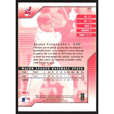 This is a 2001 Donruss Signature Series Juan Gonzalez baseball card. The card is #37 and pictures show condition.
