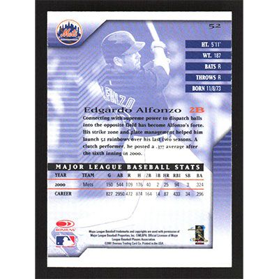 This is a 2001 Donruss Signature Series Edgardo Alfonzo baseball card. The card is #52 and pictures show condition.