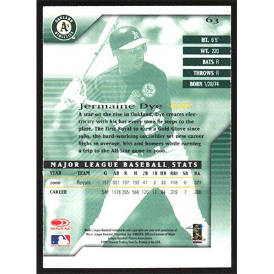 This is a 2001 Donruss Signature Series Jermaine Dye baseball card. The card is #63 and pictures show condition.