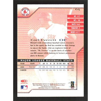This is a 2001 Donruss Signature Series Carl Everett baseball card. The card is #65 and pictures show condition.